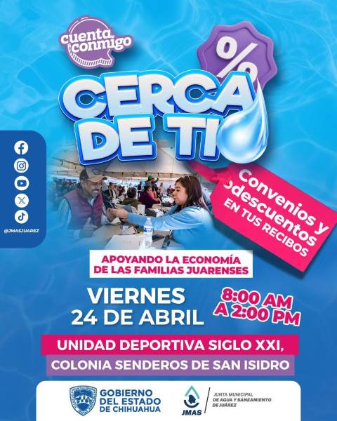 La Junta Municipal de Agua y Saneamiento (JMAS) de Juárez convocó a la ciudadanía a la jornada “Cerca de Ti”, que se llevará a cabo el viernes 24 de abril en la Unidad Deportiva Siglo XXI, ubicada en la calle Monteblanco, en el fraccionamiento Senderos de San Isidro.